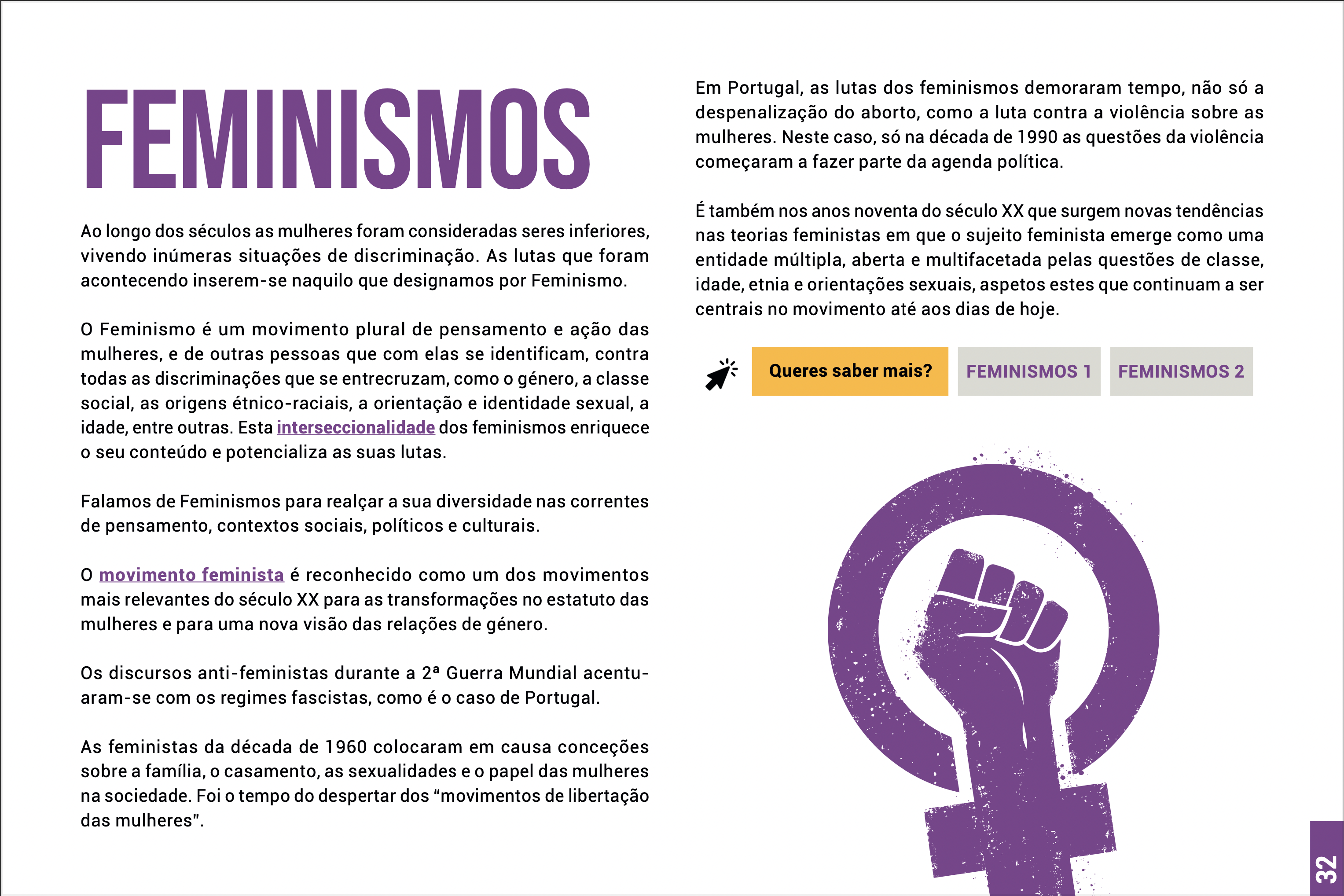The booklet “História dos Ativismos Feministas em Portugal” [History of Feminist Activisms in Portugal], developed within the scope of the FEMglocal project, seeks to stimulate public discourse, especially within educational settings, about feminist activisms and gender issues. Additionally, it aims to foster reflection on the singular narrative of feminism, deconstructing it through a logic of situated knowledge.